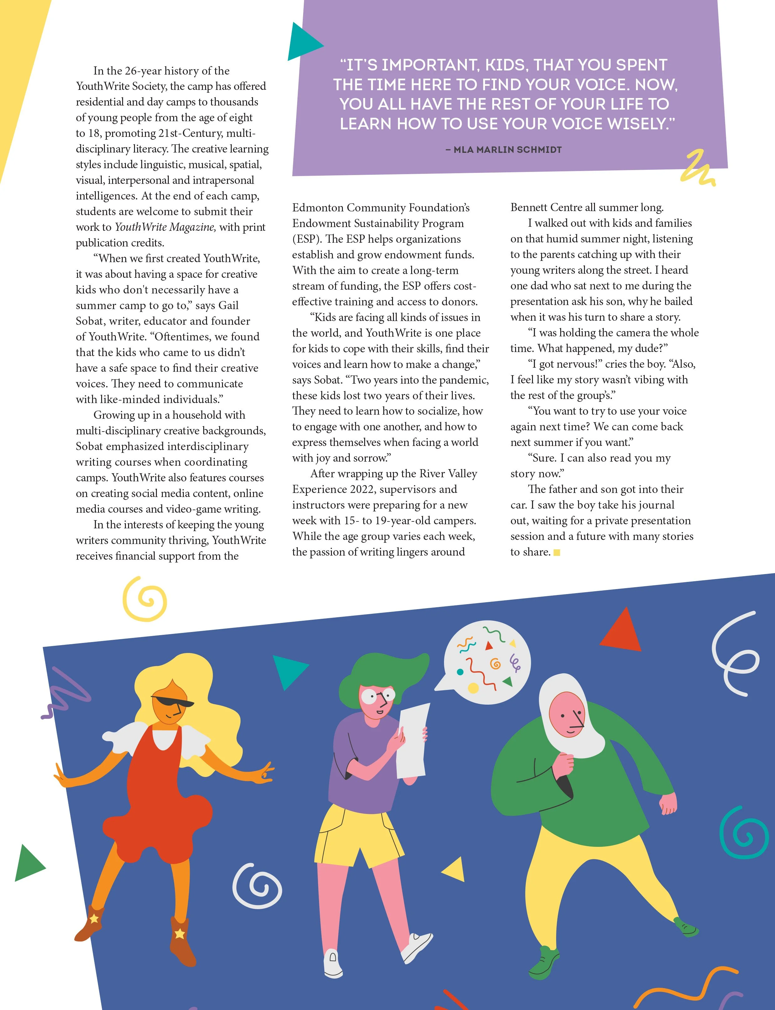 Legacy in Action is a quarterly magazine produced by the Edmonton Community Foundation (ECF), an organization that collaborates with and connects donors with charities. The magazine features stories told by some of the impacted communities, and the article “The Write Stuff” needed illustrations to promote YouthWrite, an Albertan writing camp for youth.